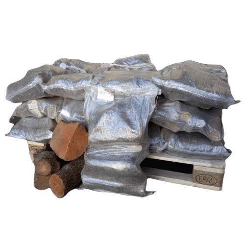 Leña de encina 100 % natural, seca y lista para usar. Este lote incluye 90 sacos de 10 kg cada uno, envasados en red para un transporte y almacenamiento cómodos.